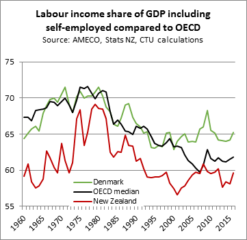 “The largest falls can be identified with wage freezes in the early 1980s, commercialisation and privatisation which boosted profits while cutting wages in the late 1980s, and the Employment Contracts Act (ECA) in the 1990s. The effect of the ECA on labour share of income lasted until employment law changes in 2004 allowed a little of the share to be regained. The positive changes were put into reverse by the 2008-2017 National Government, which led to another steep fall starting in 2009.”