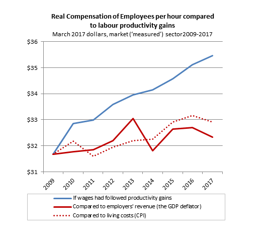 “If you look at the figures just over the previous cycle of Government, we see a similar pattern. If wage and salary earners were receiving the same share of the income as they were in 2009, their annual incomes plus other benefits would on average have been $2,500, or 4 percent higher in 2017. Workers in the sector the Commission looked at would on average have had $2,400 more or 5 percent higher annual incomes.”